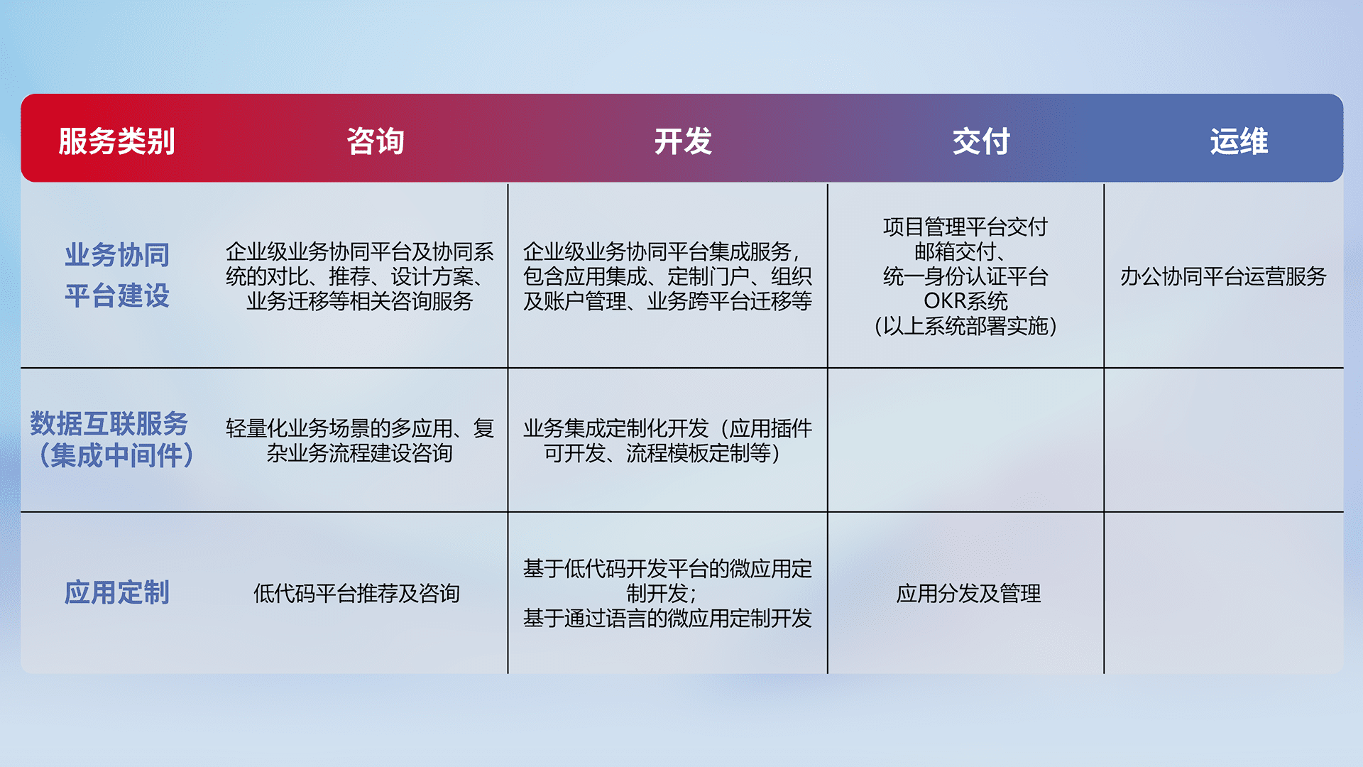 针对钉钉、、企微、、IDaas等平台级产品提供产品的规划、、方案、、交付、、、定制化开发等服务,,实现如统一协同办公、、智能客户服务、、、、混合会议管理、、智能数据查询、、等业务场景,,实现数字化转型。。。。